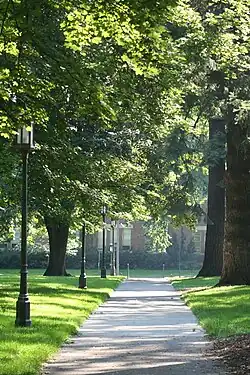 "Hello Walk" is one of the best-known and traveled pathways on the Idaho campus. It includes monuments such as Presidential Grove, where historical figures, such as Teddy Roosevelt, planted trees; the Spanish–American War memorial statue who had his hands cut off but was reconstructed by the handless sculptor Bud Washburn;[27] and Administration Lawn that was designed by the Olmsted Brothers.[28]