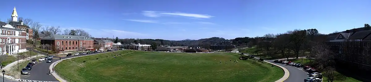 A panoramic view of UNG's Dahlonega Campus, showing Rogers Hall, Price Memorial Hall, Nix Fine Arts Center, Barnes Hall, Dunlap Hall, the General William J. "Lipp" Livsey Drill Field, the UNG Library/Technology Center, and Lewis Residence Hall.