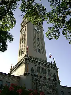 In 1936, architect Rafael Carmoega, working under the Puerto Rico Reconstruction Administration (PRRA), designed the distinctive University of Puerto Rico clock tower based on the 1924 Parsons Plan.[14] The iconic university clock tower was built in 1937 and christened as the Franklin Delano Roosevelt tower, in honor of the president and his interest in the building of the university. La Torre (as The Tower is nicknamed in Spanish) is located at the entrance of the Román Baldorioty de Castro Building.[15] Right below the tower there is a monument to the nations of the Americas portraying the coats of arms of all American states within a bronze circle, as a symbol of the Panamerican Union.[16] Under the supervision of architect Rafael Carmoega, a group of local architects designed what is known as El Cuadrángulo (The Quadrangle), a plaza-like quadrangle.[17] The campus's central quadrangle and tower were listed on the National Register of Historic Places in 1984.