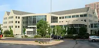 St. Thomas Law is located in downtown Minneapolis. The 158,000 square foot building opened in 2003, and sits at the corner of 11th Street and LaSalle Avenue. The $34.8 million building includes a four-story atrium, a 40,000-square-foot (3,700 m2) law library, a two-story chapel, and a classically designed moot court room.[7] The law school is connected by skyway to the downtown Minneapolis legal and business communities.