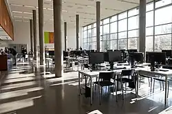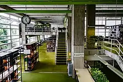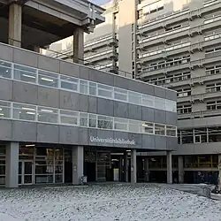 In 1961 the university was able to build a dedicated facility with the help of the Max-Kade-Foundation.[2] Planned and erected by the Stuttgart architectural firm Volkart und Zabel,[3][4] the building is modelled after American academic libraries. There are notable similarities, for example, to the reading rooms of S. Price Gilbert Memorial Library[5] of the Georgia Institute of Technology.[6] Due to subsequent developments in library operations over the past 60 years, the library today faces significant space and structural problems. In 2018 the library building was added to the list of cultural heritage sites in the state of Baden-Württemberg.[7]