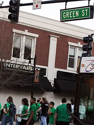 ![]() Students dressed in green for Unofficial, on Green Street in Champaign, 2009 | |