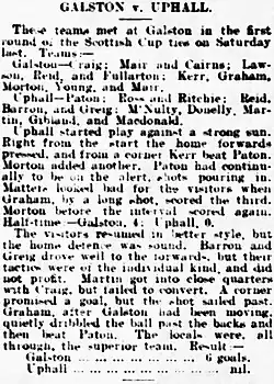 By beating Aberdeen University 3–0 in the third round, Uphall guaranteed entry into the Scottish Cup proper; despite the importance of the match there was only a "small attendance".[9] The club's Qualifying Cup run ended at Dumfries F.C. in the next round,[10] and in the first round proper the club was unlucky to be drawn at Galston F.C. rather than a Scottish League club. The club went down to a 6–0 defeat.