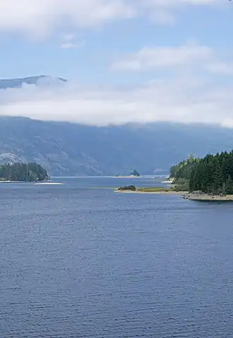 Its main tributaries are the Elk River, and the Tlools, Filberg, Cervis and Drum Creeks.[3] Its only outflow is Campbell River, which also flows in from its headwaters nearby at Buttle Lake.[1] The river flows a short distance out of Upper Campbell Lake via the Strathcona Dam into Lower Campbell Lake. Upper Campbell Lake lies in the Coastal Western Hemlock Biogeoclimatic Zone.[3]
