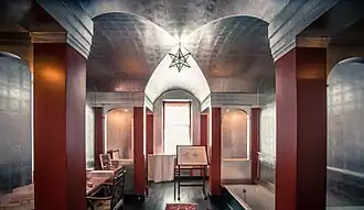 Upton is a long low house built of local yellow ironstone.[9] It was considerably expanded from 1927 to 1929 for the 2nd Viscount Bearsted by Percy Richard Morley Horder who retained the Carolean style appearance of the exterior[10] while introducing some Art Deco elements in the interior, particularly in the bathroom for Lady Bearsted, where the walls are covered in aluminium leaf. The style of interiors at Upton has been described by art critic Osbert Lancaster as Curzon Street Baroque.[11]