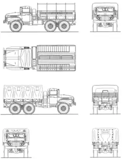 - Ural-375, the base model. It has a canvas roof, and no steel cabin