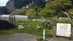 An urban farm called Kaicycle in the capital city Wellington was established in 2015. It started as a way of composting local food waste, food scraps are collected by bicycle. Their criteria includes organic waste of up to 60 litres per week from local households and business. Their purpose is "diverting food waste from landfill and recycling these nutrients back into local soils". They garden on their urban farm with the compost they make and invite volunteers to help regularly. They sell some of the produce which helps pay for the composting operations, they also share it with volunteers and donate to community food projects.[44][45][46] In 2020 it joined a new network of composting hubs managed by the Sustainability Trust.[47]