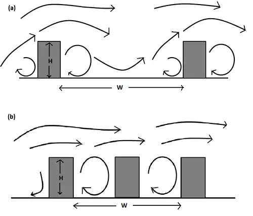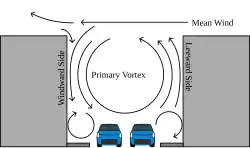 When the roof level/background wind direction is perpendicular to the street, a vertically rotating wind flow is created with a centered primary vortex inside street canyons. Based on the aspect ratio, different flow regimes are defined in street canyons. In the increasing order of aspect ratio these flow regimes are: isolated roughness flow, wake interference flow and skimming flow.[7] The total number of vortices made and their intensities depends on many factors. Numerical model studies done for isolated street canyons have shown that the number of vortexes made increases with increasing aspect ratio of the canyon. But there is a critical value of the ambient wind speed, above which the number and pattern of vortexes become independent of the aspect ratio.[8]
