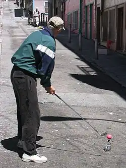 Urban golf is played without a traditional golf course, instead using street furniture as obstacles and targets.[4] Instead of a standard golf ball, players may use leather balls,[5] plastic golf balls, or tennis balls.[3] It may be played on the street as well as in other locations such as industrial brownfields, sand pits,[2] parks,[6] rooftops, and river banks.[1]