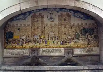 The creation of these new neighborhoods made it necessary to extend the walled perimeter, so in 1260 a new wall was built from Sant Pere de les Puelles to the Drassanes, facing the sea. The new section was 5100 m long and covered an area of 1.5 km². The enclosure had eighty towers and eight new gates, among which were several enclaves of relevance today, such as the Portal de l'Àngel, the Portaferrissa or La Boqueria.[50] A network of fortifications was also built in the urban periphery for the defense of the city, such as the castle of the Port, in Montjuïc; those of Martorell and Castellví de Rosanes, at the entrance of the Llobregat river; those of Eramprunyà (Gavà) and Castelldefels in the delta of the same river; and that of Montcada at the entrance of the Besòs river.[51]