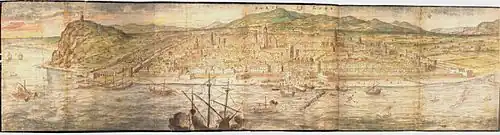 With the construction of the port, the seafront between Pla de Palau and La Rambla was embanked, thus urbanizing the Passeig del Mar, now Passeig de Colom.[61] At this time the water supply and sewage system was also improved, and for its maintenance the figure of the mestre de les fonts ("master of the fountains") was instituted, in charge of the care of mines, fountains and gutters.[62]