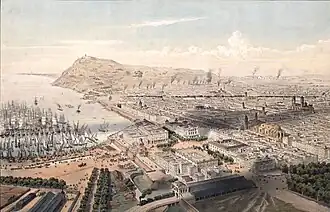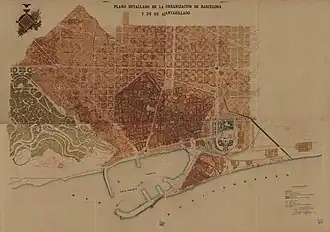 Among the main urban planning actions of these years were the opening of Calle de Fernando (Ferran) in 1827, between La Rambla and the Plaza de San Jaime (Sant Jaume), with a later continuation towards the Borne with the streets of Jaime I (Jaume I) (1849–53) and Princesa (1853).[82] In 1833 the expansion of the Pla de Palau began, which was then the nerve center of the city, with the presence of the Royal Palace, the Llotja and the Aduana. The square was enlarged and the Portal de Mar was built (1844-1848), a monumental gateway to Barceloneta from the old quarter, the work of Josep Massanès, which was demolished in 1859 along with the city walls.[83] Massanès was also the author of a widening plan in 1838 that was never completed, which included the triangle between Canaletes, Plaça de la Universitat and Plaça Urquinaona, and which already sketched what would become Plaça de Catalunya, located in the center of the triangle.[84]
