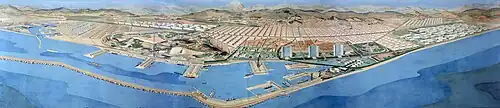 In the middle of the century, the Diputation of Barcelona took charge of establishing new road layouts in the Barcelona plain: the Sarrià road (now Sarrià Avenue), designed by Ildefons Cerdà and built between 1850 and 1853; the road from Sants to Les Corts (1865-1867); and the road from Sagrera to Horta (1871), now Garcilaso Street.[57] In these years, the port, increasingly important as a source of raw materials —especially cotton and coal—, was improved with the construction of a new wharf and the dredging of the port by the engineer José Rafo, who presented his project in 1859.[92]