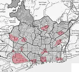 The last reform was carried out in 2006, this time aimed at establishing the neighborhoods that make up each district, with the objective of improving the distribution of facilities and proximity services.[30] Seventy-three neighborhoods were established, stipulated according to historical, cultural and social criteria, although the decision was not without controversy, mainly due to the fragmentation of some historical neighborhoods defended as units by the neighborhood associations: thus, for example, from the neighborhood of El Clot was segregated El Camp de l'Arpa; from Sants was segregated the neighborhood of Badal; Esquerra de l'Eixample was divided between La Nova and L'Antiga Esquerra de l'Eixample; and Poblenou was fragmented into five neighborhoods. Similarly, some neighborhood units were not satisfied with their aspirations to become neighborhoods, such as Can Caralleu, Penitents, Torre Melina or El Polvorí.