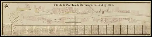 With the extension of the wall, a long avenue known as La Rambla, occupied mainly by religious institutions, was left within the city walls. It was then proceeded to its urbanization, which was completed in 1444. In its day it was the widest space in the city, dedicated to strolling, leisure or the installation of occasional markets. Deeply reformed between the eighteenth and nineteenth centuries, today it is one of the most emblematic places of the city.[56]