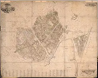 During this century, the municipal ordinances that began with the Edicto de obrería (Workmen's Edict) were consolidated: in 1814, the Pregón de policía urbana (Proclamation of Urban Police) established in 84 articles all the provisions on civil building, maintenance of public spaces and various regulations on security and public order. In 1839, the Bando general de buen gobierno (General Good Governance Charter) renewed and expanded these provisions and, among other things, regulated the relationship between the width of streets and the height of buildings. On the other hand, the law of 8 January 1845 established the City Council's own attributions in various aspects such as urban planning, regulating the sanitary conditions of public spaces, as well as the conditioning of streets, squares and markets.[80] In 1856 the first Ordenanzas Municipales (Municipal Ordinances) were approved, which brought together and expanded previous provisions, within an urban code that contemplated for the first time all aspects of civic and institutional relations in the city. For the first time, building permits were required to include an interior layout plan. These ordinances soon became obsolete due to the new Eixample plan, until in 1891 new ones were drawn up that took into account the new specificities of the expansion and new links in the city. Among other things, the area of occupation of the plots was increased from 50% —established in the Cerdà Plan of 1859— to 70%.[81]