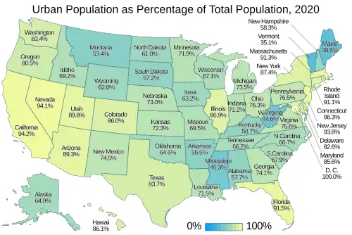 The states of Maine and Vermont have bucked the trend towards greater urbanization which is exhibited throughout the rest of the United States. Maine's highest urban percentage ever was less than 52% (in 1950), and today less than 39% of the state's population resides in urban areas. Vermont is currently the least urban U.S. state; its urban percentage (35.1%) is less than half of the United States average (81%).[2] Maine and Vermont were less urban than the United States average in every U.S. census since the first one in 1790.[2]