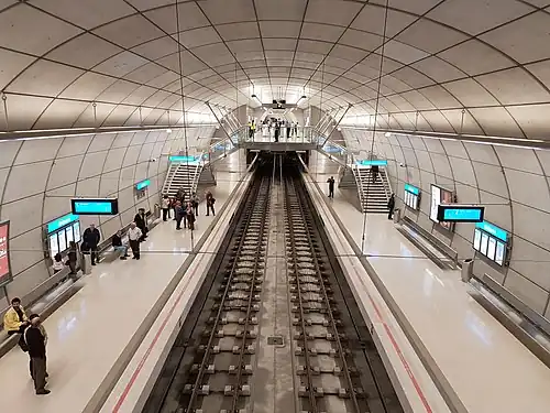 Uribarri follows the same cavern-like station layout shared by most underground stations of the system, designed by Norman Foster, with the main hall located suspended directly above the tracks.[2]