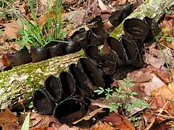 The goblet-shaped fruit body (technically an ascocarp) is 3–4 cm (1+1⁄4–1+1⁄2 in) in diameter and 4–6 cm (1+1⁄2–2+1⁄4 in) deep; initially it is closed, but opens as it matures, leaving a ragged or smooth inrolled margin around a round opening.[10] The flesh of the ascocarp walls is tough and initially gelatinous, later becoming leathery.[11] The exterior of the ascocarp is brownish black to black, with a velvety surface, while the interior spore-bearing surface, the hymenium, is brownish black in color, usually somewhat paler than the outside. The outer surface may be partially covered with small flakelike patches of tissue.[12] When viewed with a magnifying glass, the "hairs" (fungal hyphae) making up the outer velvety surface are variable in length, and are thick-walled, blunt, and appear to wind from side to side (flexuous).[10] The ascocarp is connected to a stalk that is typically 3–4 cm (1+1⁄4–1+1⁄2 in) long by 0.4–0.8 cm (1⁄8–3⁄8 in) thick,[9] with black mycelia at its base.