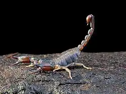 Western forest scorpions have eight legs and two large claws in front of their mouths.[5] Their bodies are more "squat" with skinnier tails than other scorpion species.[6] Western forest scorpions are typically dark brown or black. Their legs are a translucent yellowish-brown. Males have a duller color than females. Males are also smaller and shorter in length.[7] Fifth metasomal segment has a ventral median carina which forks to form a "Y".[8]