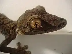 Geckos of the genus Uroplatus are nocturnal and arboreal. They range in total length (including tail) from about 30 cm (12 in) for U. giganteus to 10 cm (3.9 in) for U. ebenaui. Larger species of Uroplatus are distinguished among geckos in having the largest number of marginal teeth among all living amniotes. Their distinctive laryngotracheal complex has been used to defend their monophyly.[4] Other rare apomorphic character states include multiple inscriptional ribs, restriction of autotomy planes, and finger-like diverticula of the lungs.[5]