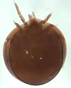 Uropodidae are phoretic on larger arthropods, meaning that they attach to larger arthropods to be transported to new places.[5] This attachment is achieved using a pedicel of translucent material extruded from the mite's anus.[5] One known host for uropodid mites is the red palm weevil (Rhynchophorus ferrugineus),[6] though this particular relationship may actually be parasitic, as mite-infested weevils have a shorter lifespan than uninfested weevils.[7]