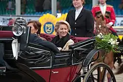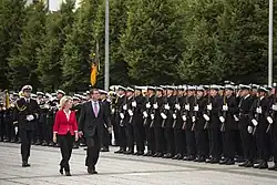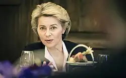 In 2005, von der Leyen joined the federal cabinet, first as Minister for Family Affairs and Youth from 2005 to 2009, then taking on the role of Minister for Labour and Social Affairs from 2009 to 2013, and finally serving as Minister for Defence from 2013 to 2019, the first woman to do so.[2] When she left office, she was the only minister to have served continuously in Merkel's cabinet since Merkel became chancellor. She served as a deputy leader of the CDU from 2010 to 2019, and was regarded as a leading contender to succeed Merkel as the chancellor of Germany and as the favourite to become the secretary general of NATO after Jens Stoltenberg. British defence secretary Michael Fallon described her in 2019 as "a star presence" in the NATO community and "the doyenne of NATO ministers for over five years".[3] In 2023, she was again regarded as the favourite to take the role.[4]