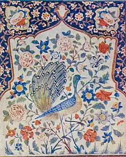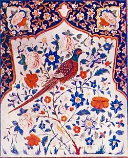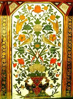 Later works of Karabakhi, saving a mastery of ancient decorative paintings, are distinguished for growth of realistic features in interpretation of distinct graphic motifs. A picture drawn by him in the house of Mehmandarov in Shusha city, where images of deer and pomegranate tree are distinguished for their free interpretation and sappiness of forms, is the most famous picture of the artist. The artist created on the basis of both earlier developed canonized schemes and immediate observations.[8]