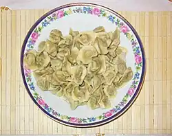 Uszka (Polish: [ˈuʂka] ⓘ) or vushka (Ukrainian: вушка [ˈwuʃkɐ]; Belarusian: вушкі [ˈvuʂkʲi]; lit. 'little ears') are small dumplings[1] (a very small and twisted version of pierogi) usually filled with flavourful wild forest mushrooms and/or minced meat. They are usually served with borscht, though they can be eaten simply with melted butter and herbs (usually chives) sprinkled over. When vegetarian (filled only with mushrooms or onion) they are a part of traditional Christmas Eve dishes in Poland,[1] Belarus,[2] and Ukraine, and are either added to the soup, or eaten as a side dish.[3]