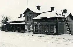 Its original Class III station building was built according to plans from Knut Nylander, and was completed in 1869. The premises of the station also included a freight warehouse, outhouse, guard's cabin as well as a water tower for maintenance of steam locomotives. The station building was completely destroyed by the fire bombings in March 1940, and was replaced by a new one later in the same year. It is representative of the simple architectural principles of stations from the wartime era with its rectangular shape. A small warehouse is directly connected to the main station building via one of its walls. Save for this warehouse, the building originally had a light plasterwork on its outer surface, but it was later entirely covered with painted wooden boards.[4]