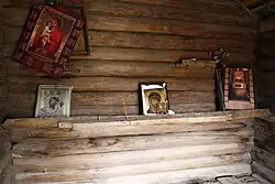 There is a wooden icon table on the rear wall of the building. A candle table is attached to it, with holes drilled inside for the candles. A little higher is a shelf for one icon with embellished front edge. Three old icon frames are situated on the icon shelf and in the rear wall, with new printed icon pictures in them. According to 1974 descriptions (Kupp 1974) the icons were still there, but had decomposed. There are a few printed icons hung on the rear wall. A forged hook fixed on the ceiling for holding an oil lamp has also remained from earlier times. During 1974 expedition, a few interesting furnishings were discovered, described as follows: “A few ethnographic items may be of interest: 2 candle sticks. Both of them have been made of wood, first one is carved, the other one probably turned. The bases are round-shaped. A bench for the fresh-harvested crop. The bench is hewn from boards, it is rather old. The length of the bench is 1.09 m, width 0.41 m, height 0.72 m. It is of museal interest.” (Kupp 1974).[1]