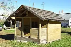 Uusvada tsässon is a small one-storied unhewn pine cross-beam building, which has a square floor plan and a gable roof, the outer measurements are 308 x 409 cm; the building has one interior room (7.2 m2) and an external shelter (2.5 m2). The shelter has wane beam posts and a horizontal wide boarding fence. The main part of the building is covered by narrow horizontal boarding from the outside; from the inside the beams are uncovered. The beams are bound by axe-hewn corner tenon joints from the corners. The walls of the building stand on granite stones. The height of the building from the ground up to where the rafter and the wall unite is 188 cm and the height up to the ridge is 320 cm. There is a wooden decoration sawn round and tenoned vertically in the front end of the ridge raising-plate. There are no ceiling or floor beams.[1] The building has a floor made of half-beams axe-hewn on the top. They support on the slots in the front wall. The width of the beams is different, 10 cm on average. The floor of the entrance-room is original and consists of the same half-beams axe-hewn on top. The building has one round ridge raising-plate remaining and rafters with hewn sides and profiled ends. During 2009 renovation, the tsässon got a new shingle roof and a forged cross that was on the ridge during the 1980s. The door of the building is probably original. The leaf of the door is made from four wide boards fixed on the crosspiece, sized 153 x 84 cm. The door opens on the inside and is fixed on the hewn supporting posts by forged hinges. The door is not painted. There is no handle on it, old forged staple and clamp have remained on the outside, but the building is not locked. A finely drawn orthodox cross on the outside of the door is especially noteworthy. Looking at the earlier photos, it is possible to fixate the time of the different re-buildings of the tsässon: A photo from the beginning of the 20th century shows that the exterior walls are without planks, there is a shingle-roof and the entrance-room is exposed. The walls on the 1974 photo have narrow planks on them; part of the entrance-room fence is also replaced by planks. There is a shingle-roof and a different cross than before. From the photo dating back to the 1980s, it can be seen that the shingle-roof had eternit installed on top of it and there is no cross. At the end of the 1980s, a different cross had been placed on the roof.[1]