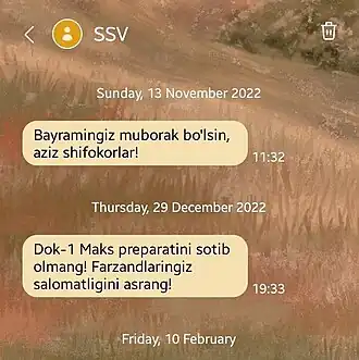 - ^ "Qoraqalpog'istonda "Dok-1 Maks"dan zaharlangan ikki bola davolanish uchun Toshkentga olib kelingani ma'lum bo'ldi". daryo.uz. Retrieved January 6, 2023.