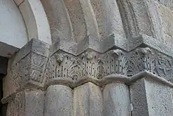 The facade of the nave and chancel are decorated with lesenes at the corners, and corbel tables supporting the cornice at the height of the original walls; the top part of the nave walls are later and whitewashed. The apse is divided by four narrow columns, double corbel tables and a more marked cornice supporting the roof. Originally there were three portals leading into the church, of which the western one has been preserved relatively intact.[28] The northern portal has vanished and the southern has been altered. It now connects the sacristy, located in the base of the tower, with the nave. The western portal still serves as the main entrance and is a round arched portal decorated with decorated capitals. The southern capitals are decorated with plant ornaments and the northern with figurative sculptures.[29] The southern portal, now only visible from inside the sacristy, has an equally rich sculptural decoration.[30] From the northern portal nothing remains except the decorated tympanum, found during the renovation of the church in the 1960s. Its decoration is almost identical to sculptures found in Lund Cathedral.[31] Four original sculpted stones, depicting beasts and religious symbols, are also incorporated in the eastern part of the facade.[28] In 1945, it was discovered that the weather vane on the roof was an aquamanile in the form of a knight on horseback, dating from the Romanesque era, i.e. the construction period of the church. It is one of only two such aquamaniles known in Sweden. The aquamanile was subsequently restored and exhibited in the church. A simplified copy was made to replace it as a weather vane.[32]