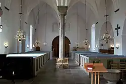 The baptismal font of the church is a copy of the original, which was moved to the Swedish History Museum in Stockholm in 1867. The original font dates from sometime between 1175 and 1225 and is decorated with floral decorations and part of the text of the Hail Mary.[50] On the north wall of the nave hangs a wooden cross, dated to c. 1400 on stylistic grounds.[3] During the renovation of the building, a wooden altarpiece from 1674 was moved from the chancel to the north aisle. The central panel of the altarpiece contains a depiction of the Last Supper, while the upper part contains the coat of arms of both County Governor Magnus Durell and the coat of arms of Sweden. As Sweden had conquered the province from Denmark in 1658, the installation of the altarpiece can be seen as a political statement.[51] The wooden pulpit dates from 1630. Its sides are decorated with sculptures depicting the Four Evangelists.[52] The simple altar is the fourth altar of the church and was made in 1966, together with a golden cross designed by goldsmith Sven Arne Gillgren.[53]