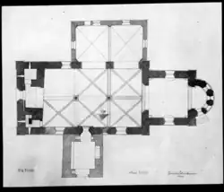 The church originally consisted of a nave with a flat wooden roof, two western towers, a western entrance and a barrel vaulted chancel with an apse.[3] It was possibly built in two stages, and finished by the time it was donated to the Premonstratensians in the 1160s.[16] It then served as the church of their monastery and simultaneously functioned as the parish church of the borough of Vä, probably during the entire Middle Ages.[17] The Premonstratensians made few changes to the church. A southern entrance was created, the west entrance altered and, possibly, a rood screen installed.[18] A fire ravaged the building in 1213, and after this the monks moved away to found a new monastery on the site of present-day Bäckaskog Castle.[19]