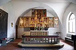 The other furnishings of the church are from after the Reformation. The pulpit was made in the 1620s and altered in 1742. The pews are from the 18th century, and the baptismal font was made in 1967.[1]