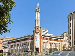 Chronologically the first major project was headquarters of the insurance company La Vasco Navarra (1924).[43] Along few large residential villas[44] the same year Eusa produced the plan of the Hijas de María Immaculada monastery.[45] Puente de San Jorge in Alcoy turned out to be the only bridge he designed (1926).[46] Casa de Misericordia was the first monumental, multi-volume establishment, designed with no restraints related to size. It included a number of in-built facilities, like a large chapel (1927).[47] Residential villa for Eguinoa brothers demonstrated ingenuity embodied in mid-size construction (1928).[48] Eusa returned to religious theme with the church of Padres Paúles, known as La Milagrosa (1928).[49] Colegio de los PP. Escolapios, a 3-storey enormous multi-wing building, was Eusa's most ambitious project so far and is one of his most iconic works (1928).[50] Basilica of Nuestra Señora del Puy in Estella turned an essay in geometry (1929),[51] while residential multi-dwellings at Plaza Príncipe de Viana marked his urbanistic capacity (1930).[52] A 7-storey edifice hosting Casino Eslava, with meticulously designed interior, was Eusa's last major work of the monarchy (1931).[53]