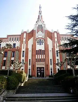The first project of the Republican era was perhaps Eusa's most important work, usually listed first among his designs: Seminario Conciliar de San Miguel (1931).[54] Planned on massive scale for the plot of 98,000 sq.m., with numerous wings and internal yards, it was designed as a Pamplona landmark. Its giant cross on the front facade spoke volumes at the time when newly adopted law prohibited presence of religious symbols in public space.[55] Residential multi-apartment buildings at calle García Castañón, chalé de Erroz villa and a tennis club followed (1933).[56] Eusa returned to major projects with schooling establishments in Zudaire and Fuenterrabia (1933),[57] and then with crèche of San Manuel in Tafalla, designed with adjacent church. (1933).[58] A group of twelve 5-storey buildings hosting 400 flats is his most notable work in large-scale urbanistic design (1933).[59] The last project completed before the war was the Clinic of San Juan de Dios, another complex, large scale construction (1935).[60]