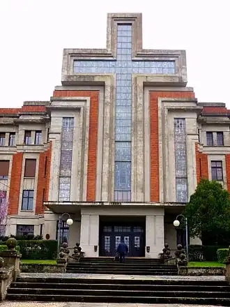 The late 1920s and the early 1930s produced full esthetic maturity embodied in the trademark Eusa's style of art déco, at times referred to as “déco expressionism”[79] or simply as “expresionismo”.[80] Its best achievements are the Paules convent, the Escolapios college, the El Puy basilica,[81] the Eslava casino and above all, the San Miguel seminary.[82] Afterwards and well into the late 1930s Eusa underwent a “rationalist evolution”, demonstrated by utilitarian turn to residential buildings in the Pamplonese II Ensanche and in the San Juan clinic.[83] In the 1940s this phase gave way to urbanism, marked by parks, gardens, cemeteries and other public zones, including monuments.[84] This is also when Eusa embraced classicism or “estilo clásico nacional”; its most powerful demonstration is Monumento a los Caidos.[85] Later Eusa's works, dated at the late 1950s and later, are described as constructions marked by functional design and decreasing stylistic features. Apart from the above major categorizations, other style references sporadically applied to his architecture are symbolism,[86] medieval historicism,[87] Dutch neoplasticism,[88] beaux arts,[89] “simplismo”[90] and the neomudejár style.[91]