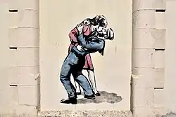 In the 2010s, bloggers began calling the photograph a documentation of a type of "normalized sexual assault".[39] The people pictured in the photograph did not previously know one another. Drunk at the time of the photograph, the sailor is shown kissing an unwilling partner (according to historic preservationist Kafi Benz, among the four frames taken by Eisenstaedt, available through Getty Images, the woman is shown defensively punching the man in the face with the closed fist of her one, free arm).[40][41][42] The widely agreed-upon identity of the woman who is a subject in the photograph, dental assistant Greta Zimmer Friedman, had also explicitly stated that the kiss she was subjected to, was not a consensual act, that he just "grabbed" her.[43] Combined with bemused expressions on some of the bystanders and the sailor's firm grasp of the nurse, the situation has been described as emblematic of a time when women were "subordinated to men", or that of a rape culture.[39]