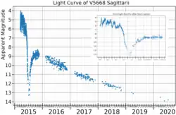 V5668 Sagittarii's peak brightness was followed by a series of fluctuations in brightness, then a strong decline of 7 magnitudes during June as the nova went through a dust formation phase.[4] The light curve for this event is very similar to the DQ Herculis intermediate polar, and it shows a coincident oscillation in X-ray flux with a period of 71±2 s due to rotation of the white dwarf. The white dwarf and its companion star are surrounded by a dusty shell of ejected material.[9]