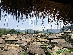 The Wa originally had animist religious beliefs[7] centered around ritual blood sacrifices. Villages had a spirit healer (Tax Cao Chai) and the traditional way of dealing with sickness or other problems was to sacrifice a chicken, a pig or a larger animal, depending from the magnitude of the affliction. According to local legend, the practice of cutting a human head was intended as a ritual sacrifice in order to improve the fertility of the rice fields. Traditional villages had also shrines (Nyiex Moeg) where a buffalo was sacrificed once every year at a special Y-shaped post named Khaox Si Gang with an offering of the blood, meat and skin performed at it. Additionally, among the traditional spirit-worshiping Wa—a practice that still exists among the Christian Wa—animals were sacrificed at festivities like weddings and funerary rituals. However, the Wa that were under Buddhist influence developed different traditions.[8]