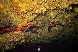 Vaadhoo Caves are a group of underwater caverns located on the northwest outer reef of Vaadhoo Island in the South Malé Atoll, Maldives.[1][2][3][4] The site is situated along the reef wall of Vaadhoo Kandu and comprises a series of small caves,[5][6] overhangs,[7] and a primary cavity with an entrance depth ranging from approximately 7 to 25 meters.[8][9] A larger overhang is present at around 30 meters, and a narrow passage with a swim-through is located between 16 and 24 meters.[10][11]