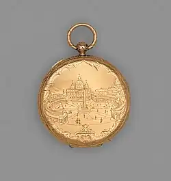 The Reference 57260 is part of Vacheron Constantin's lineage of tailor-made grand complicated pocket watches since James W. Packard's pocket watch (1918), which was auctioned for US$1.763 million by Christie's in New York on June 15, 2011.[63][64] In addition, the Vacheron Constantin pocket watch Ref. 402833 (1929), which was tailored for King Fuad I of Egypt, ranks as one of the most expensive watches ever sold at auction, fetching US$2.77 million (3,306,250 CHF) in Geneva on April 3, 2005.[11][45] In 1946, Vacheron Constantin tailored a complicated pocket watch for King Farouk of Egypt, the successor of King Fuad I, and in 1948 the company tailored another one for Count Guy de Boisrouvray of France.[65][66]