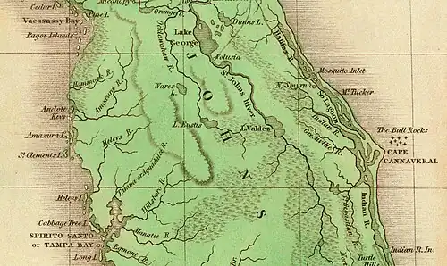 Valdez was named in honor of Antonio Valdez, the secretary of the Spanish navy in 1787, when the Spanish explored the area.[3] He chose one of his protégés, Lt. Jose del Rio Cossa, to conduct an exploratory survey of Florida's naval store resources. In this survey, Cossa created an enormous map in which he renamed Lake George (now Lake Monroe) to Laguna Valdez. Although this name did not persist, pre-American land deeds referred to what is now Lake Monroe as Valdez.[4]