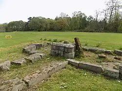 Nothing remains of the great church and "virtually nothing"[127] of the other ecclesiastical buildings, although archaeological work has revealed many details of the church's structure.[120] According to A. Emery, "detailed examination of the roof ... has revealed hidden structural evidence beneath layers of post-medieval changes".[127] Excavations by the Manchester architect Basil Pendleton were made in 1911–1912,[17] which he focused around the Nun's Grave. Pendleton established that the church had been 421 feet (128 m) long, with a decoratively floored 92-foot (28 m) nave. The combined width of the east and west transepts was 232 feet (71 m).[15] The remainder of the construction was, at various times, around a grassed quadrangle—possibly a 140-foot-square (43 m) herb garden. Apart from the church (which took up the east side of the square), the buildings consisted of a chapter house,[note 34] the abbot's dwelling, guest accommodations, and the outbuildings necessary for the upkeep of the community and its agricultural work.[130] Much of the abbey's stonework was sold by Holcroft when it was destroyed.[58] Some was used to build a common well;[103] at least one domestic garden in Northwich contained original carvings and bosses,[131] and abbey stones were found in the walls of three other houses.[103] It is possible that the ceiling of Weaverham church's north aisle came from Vale Royal.[132] Holcroft also rebuilt the western grange for his own use with stone from the church.[88] The south wing of the extant building incorporates the original refectory roof, which has been dendrochronologically dated to the second half of the 15th century. It consisted, writes Emery, "of a timber-framed three-bay hall, open to the roof, flanked by a pair of single bay rooms, the whole set above a masonry ground floor".[127] The 1958 excavation uncovered the 1359 additions, including the chevet apse.[17] Pieces of stained glass were uncovered in Delamere Forest,[77] while Purbeck marble and other architectural fragments were also found.[88]