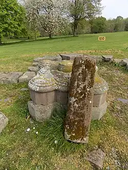 Historian Jeffrey Denton has suggested that Vale Royal Abbey has been relatively unexamined by scholars because of its near-total mid-16th-century destruction; "had it survived, our views of Edward I's relations with the Church may well have been radically different".[19] A circular stone monument, known as the Nun's Grave, reportedly commemorates Sister Ida, thought to be a 14th-century Cheshire nun who nursed an unnamed Vale Royal abbot, and who was buried at the high altar.[15] The monument was erected by the Cholmondeley family, possibly to lend credence to the legend of the nun. The material in its construction is from three sources: the head from a medieval cross whose four panels depict the crucifixion, the virgin and child Jesus, St. Catherine and St. Nicholas; the shaft, made of sandstone in the 17th century; and a plinth from a reclaimed[133] pillar base. Pevsner's Buildings of England has described the monument as looking "convincingly late 13th-century",[1] and notes other remnants of pillars around the grounds "of great size and elaboration".[1] The present country house on the site incorporates parts of the south and west ranges;[134] the former has a door arch from the abbey, one of the few elements of the original abbey which is still visible.[58] At least some of the original abbey still survives to the first floor; in 1992 a British Archaeological Association study discovered late-medieval graffiti scratched into plasterwork on an internal wall.[135][note 35] Holcroft's Tudor house also stands. The building is a Grade II* listed building,[136] and St Mary's church is listed at Grade II,[134] while what remains of Vale Royal Abbey is a scheduled ancient monument.[120][121][136]