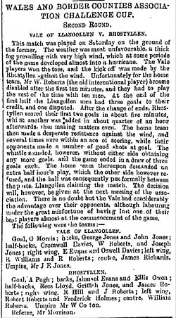 The club was drawn at home to Oswestry in the first round of the Cup, and lost 3–1;[4] Vale protested that Oswestry had not registered all of its players, and the match was re-played in Llangollen a fortnight later Oswestry - presumably having sorted the registration issues - fielded the same XI, and won again 2–0; the Vale was compromised as Oswald Davies, who had scored in the original match, was injured and unable to play.[5]