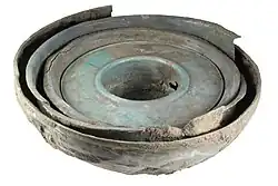 A hoard consisting of a bowl strainer, two basins and a bowl was found at Wilcot in 2017. It has been designated by the Portable Antiquities Scheme as WILT-047110.[4]